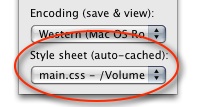 Style sheets can be attached to documents without using <link> or <style> tags. This is useful for writing blog entries or forum postings, where you want to test how it will look when published. To attach a style sheet to the document, select "Other..." from the Style sheet pop-up menu in the Options palette and select your file.